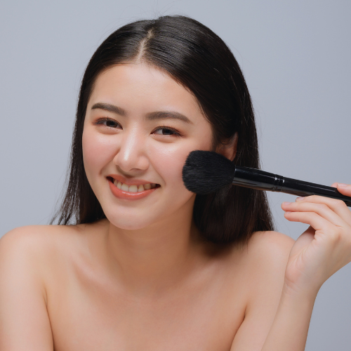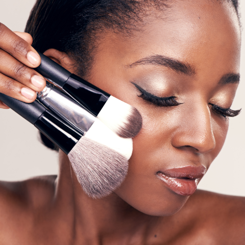 Use a fluffy brush for light coverage, a dense brush for medium, or a sponge for full coverage.